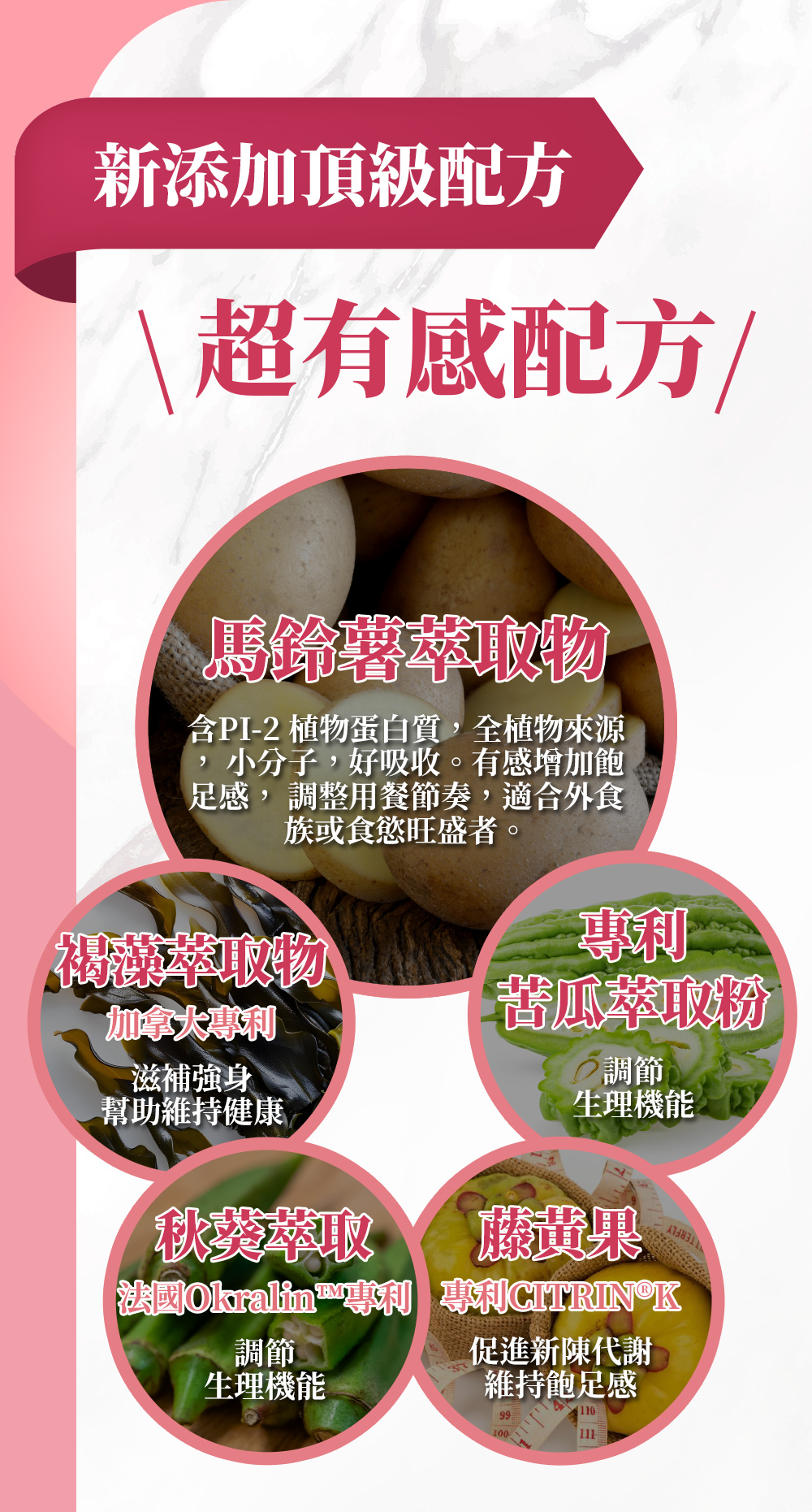 ■ 頂級褐藻、馬鈴薯萃取、專利苦瓜萃取