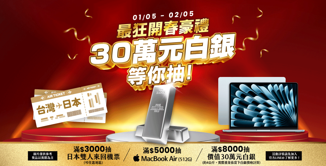 至2026-02-05T04:00:00.000+00:00截止 全店,【元旦加碼】全館滿$8,000抽【價值30萬元白銀】1名